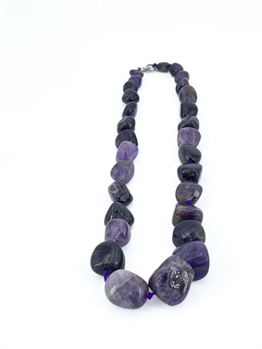La collana Ametis celebra la bellezza unica delle pietre dure. L’ametista con il suo colore viola emana una sensazione di calma e serenità, rendendo questa collana un simbolo di equilibrio interiore e bellezza senza tempo, cattura l'attenzione e incanta lo sguardo. Il design presenta una gradazione di sassi burattati, ognuno con una forma e una tonalità unica, che si fondono armoniosamente lungo la lunghezza del gioiello. La loro forma irregolare e la varietà di colori e sfumature rendono ogni collana unica nel suo genere. La chiusura è in ottone. Porta con te la forza e la bellezza della natura! Indossala come punto focale sul décolleté creando uno stile unico e audace. Tutti i nostri gioielli sono nichel free, cadmium free e ipoallergenici. N.B.: il colore e la forma del prodotto visualizzato sul monitor possono presentare lievi variazioni rispetto agli articoli reali, a causa delle condizioni di illuminazione durante la fotografia e della calibrazione individuale del colore dello schermo. Per ulteriori dettagli sull'articolo, ti invitiamo a contattare Nelibe. MATERIALE: ametista, chiusura ottone FORMA: sasso burattato DIMENSIONI: 50-54 cm circa QUANTITA': 1